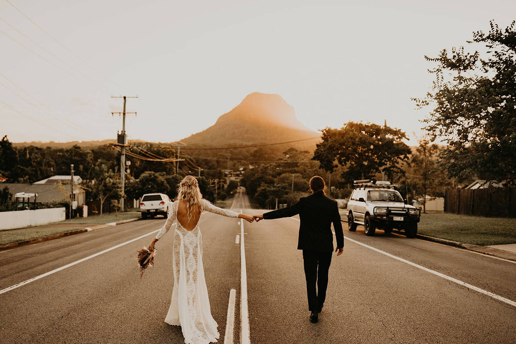 Grace bride Kara and Matt tied the knot at Hillview, Queensland... With a cocktail, festival style celebration, glamping tents, a pizza truck and a donut tower for dessert. -