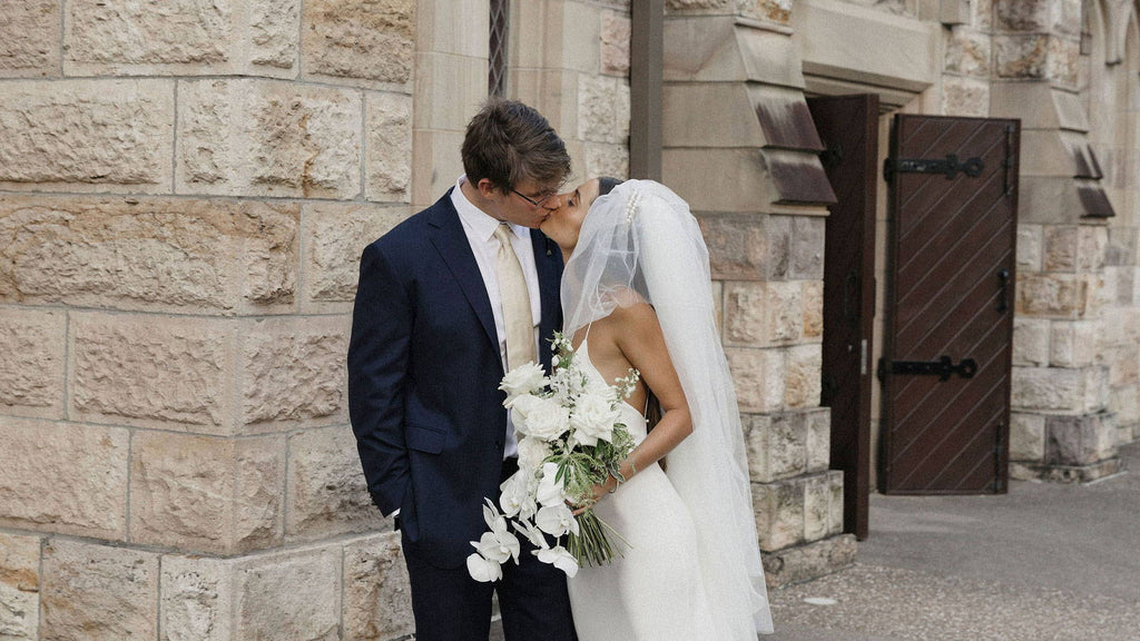 Taylor and Micah had an intimate wedding outside of Siena, Italy in a 16th century chapel. #GRACEBride Taylor styled her Olive gown with our Lumi Veil! -