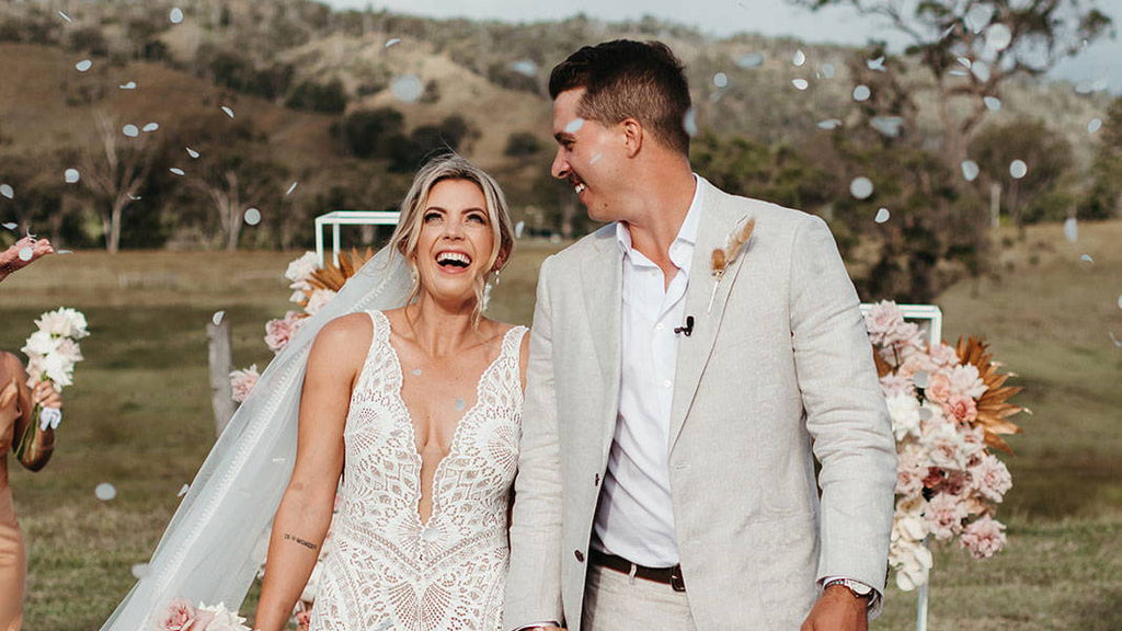 A relaxed countryside wedding, featuring our signature Alexandra gown. -