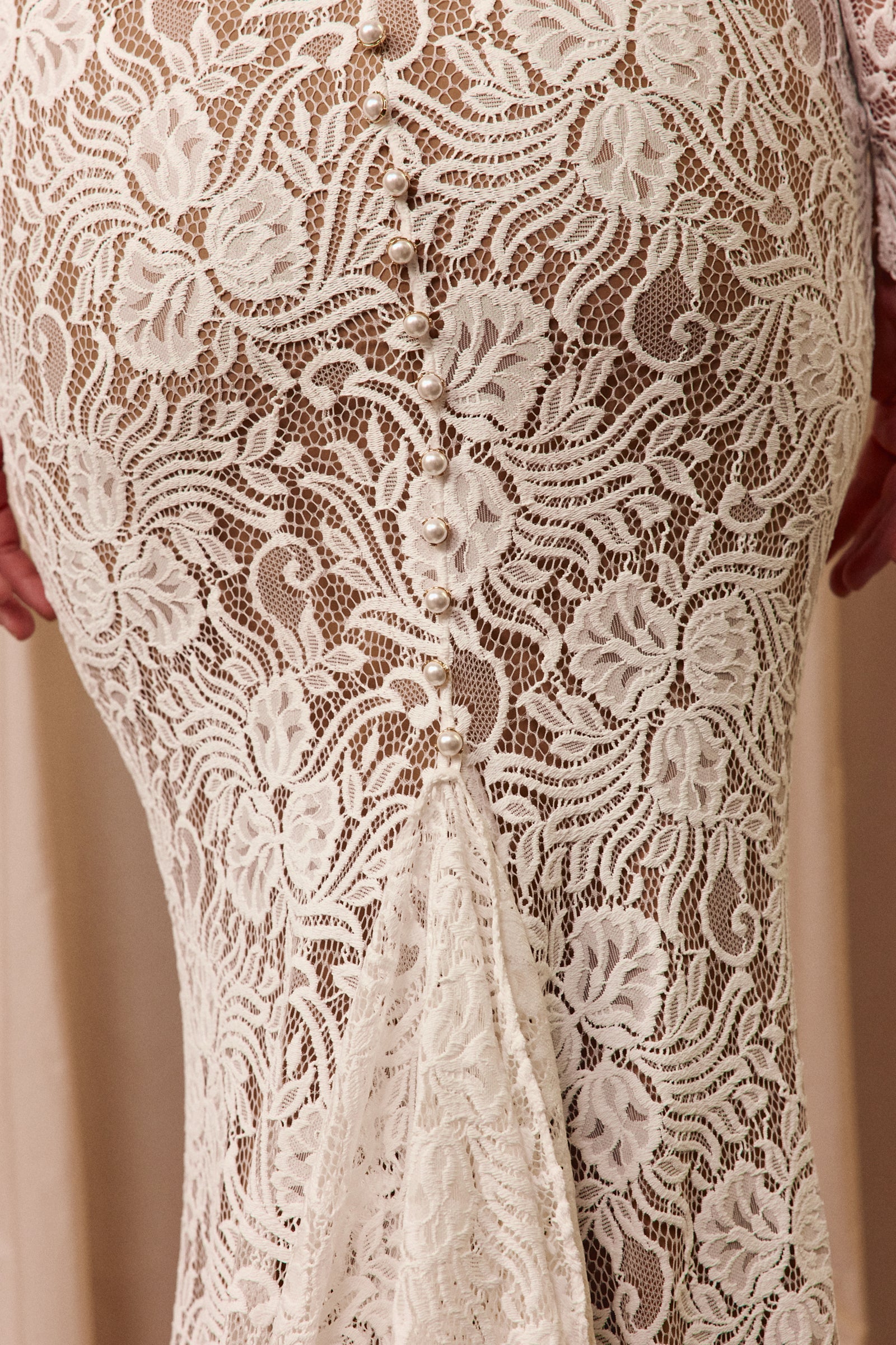 An iconic detail is the line of pearl-effect buttons creating a refined focal point at the front, echoed by a full row of pearl-effect buttons down the centre back, tracing the body and accentuating the gown’s length.