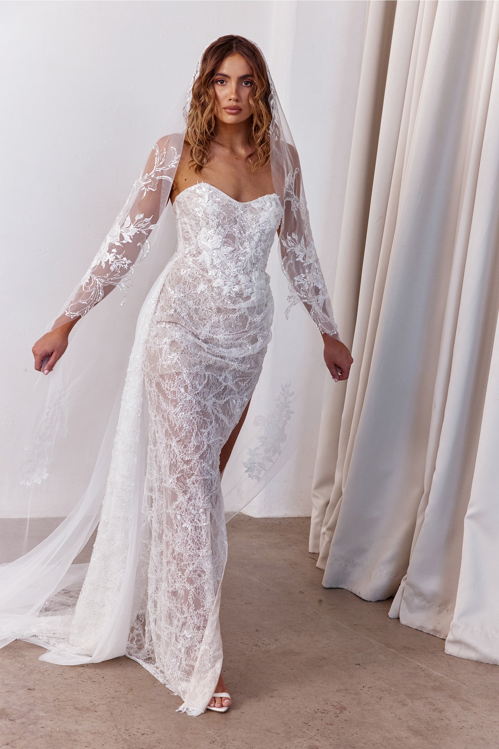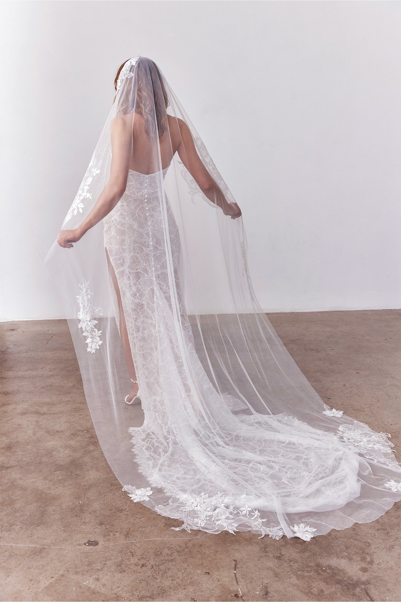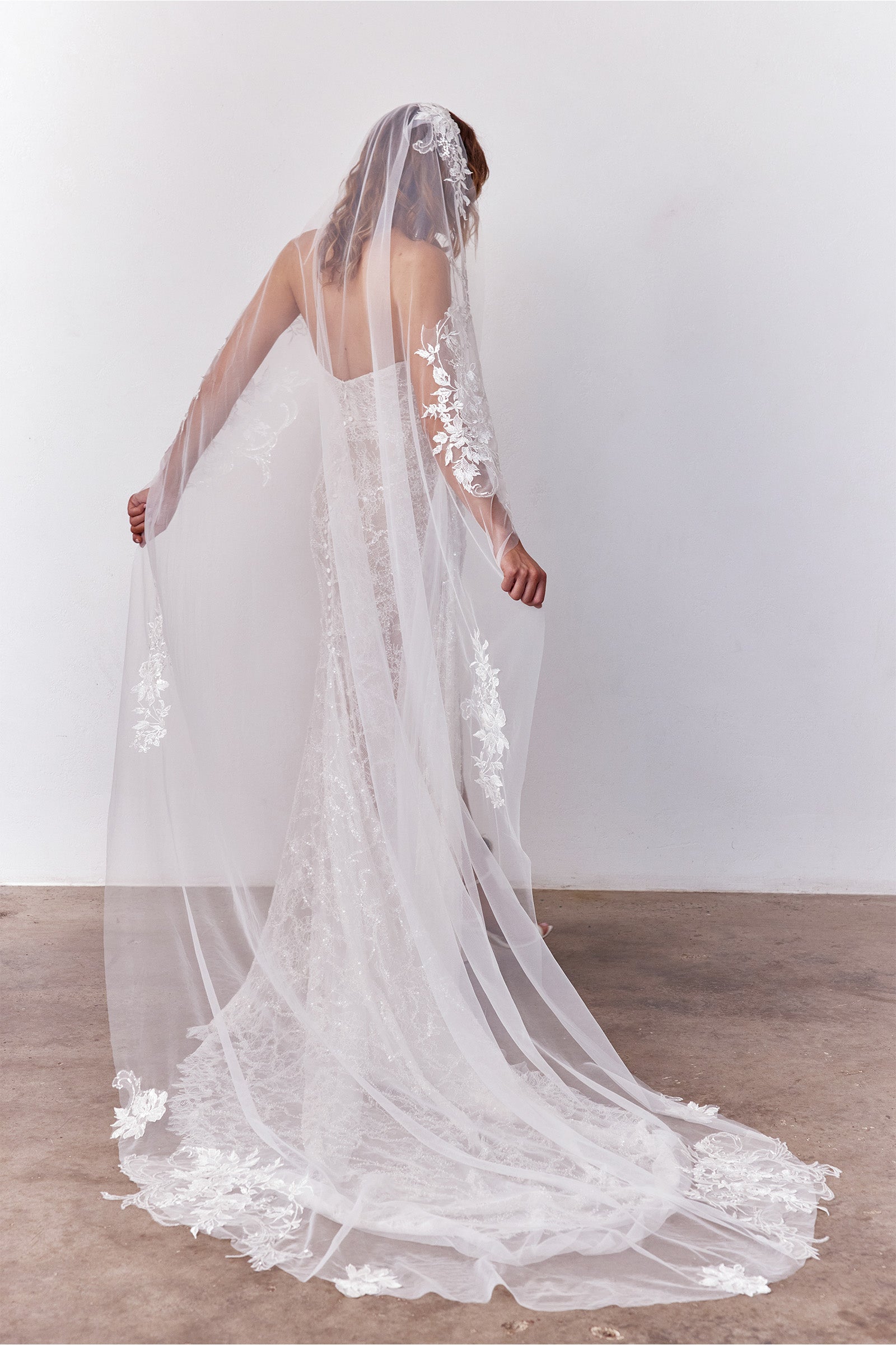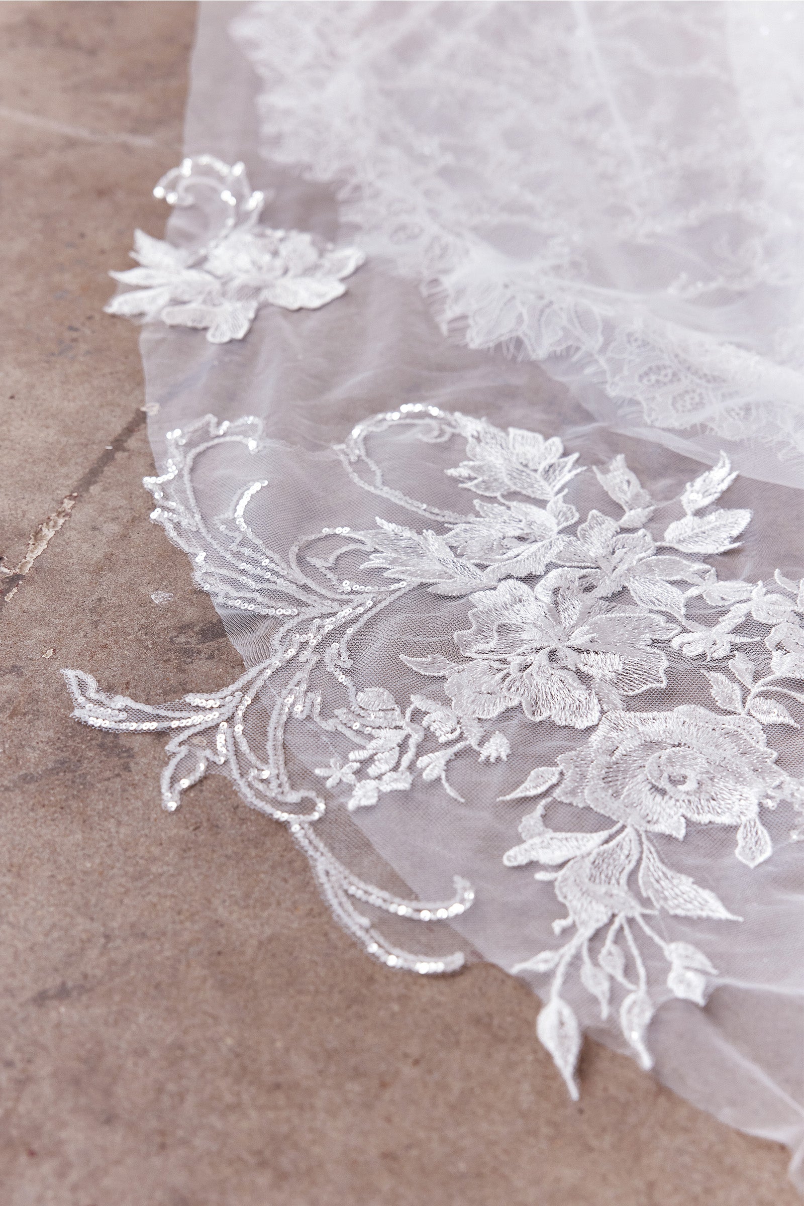 Adorned with beaded, embroidered floral motifs, this wedding veil is delicate and ornate, yet carries an unexpected edge—bold enough to stand alone, so you can keep your styling simple.