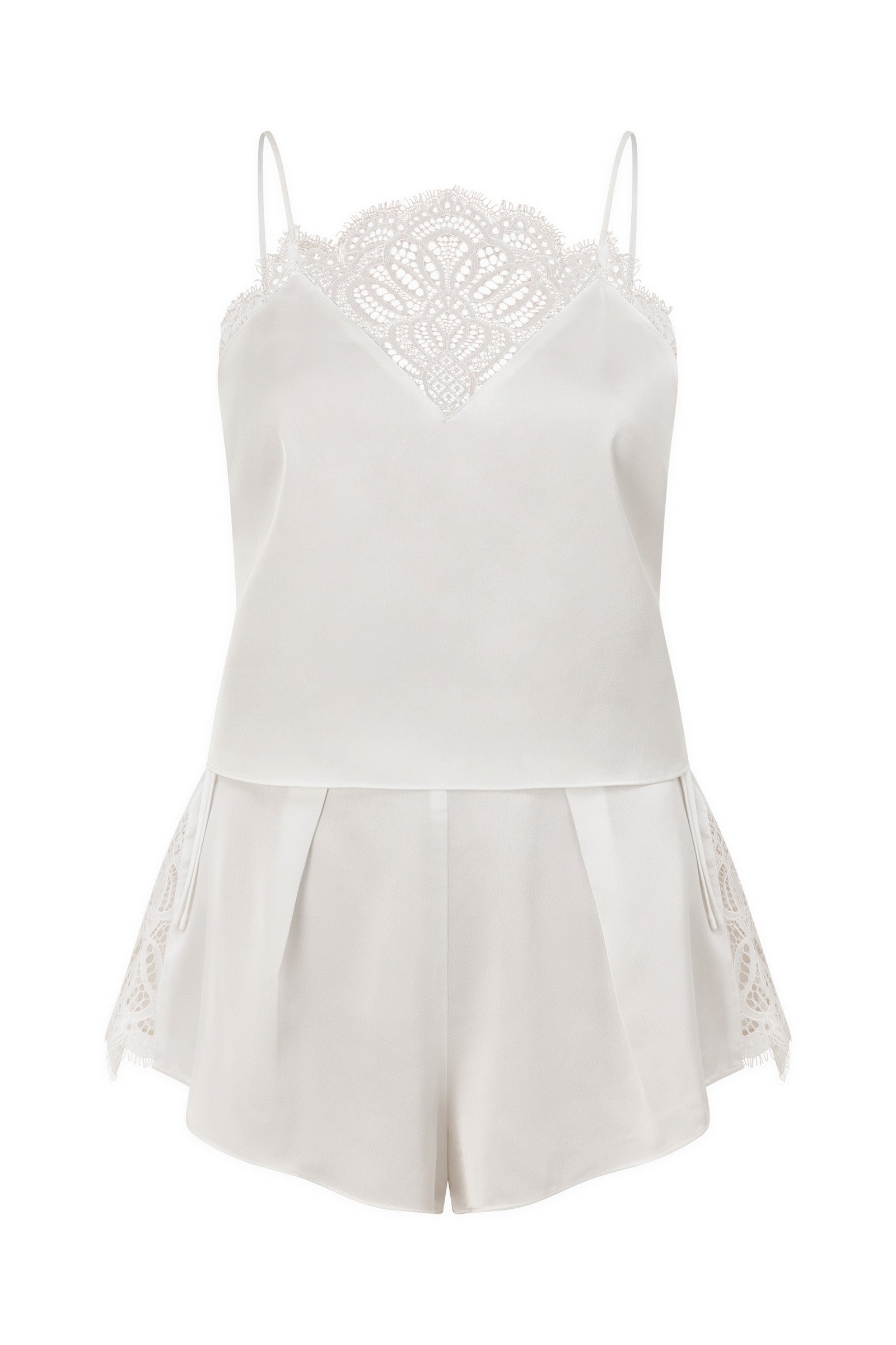 With a delicately scalloped lace neckline and pleats along the shorts, this set is ultra-feminine in every detail.