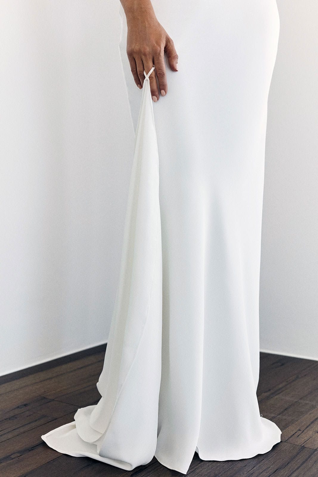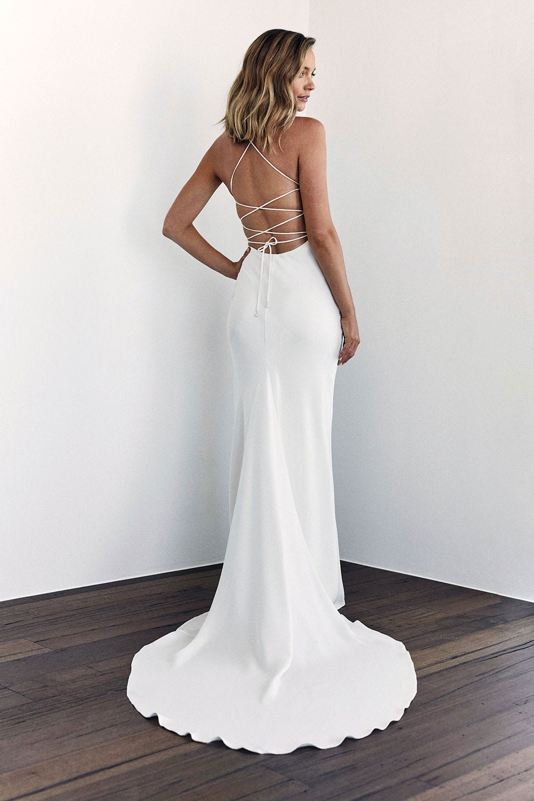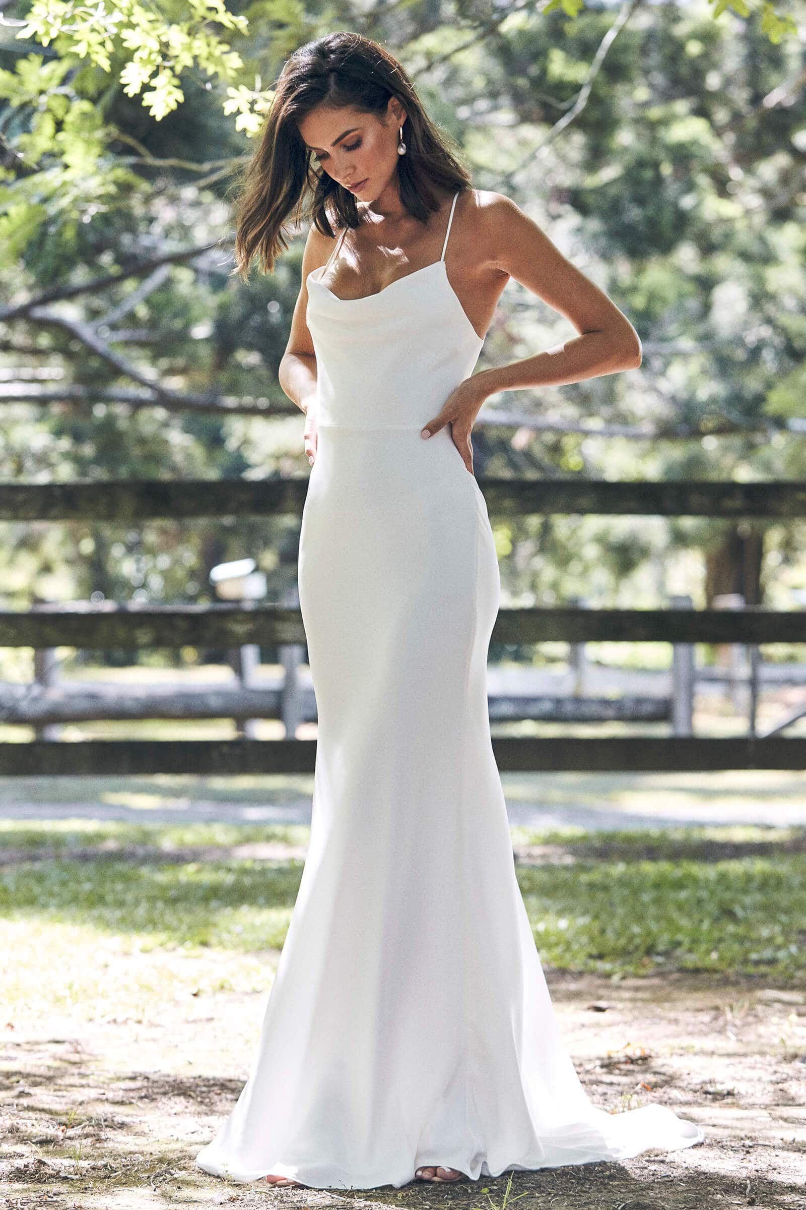 This silk wedding dress features thoughtful details, with a cowl neckline and adjustable silk rouleau ties crossed through the open back.