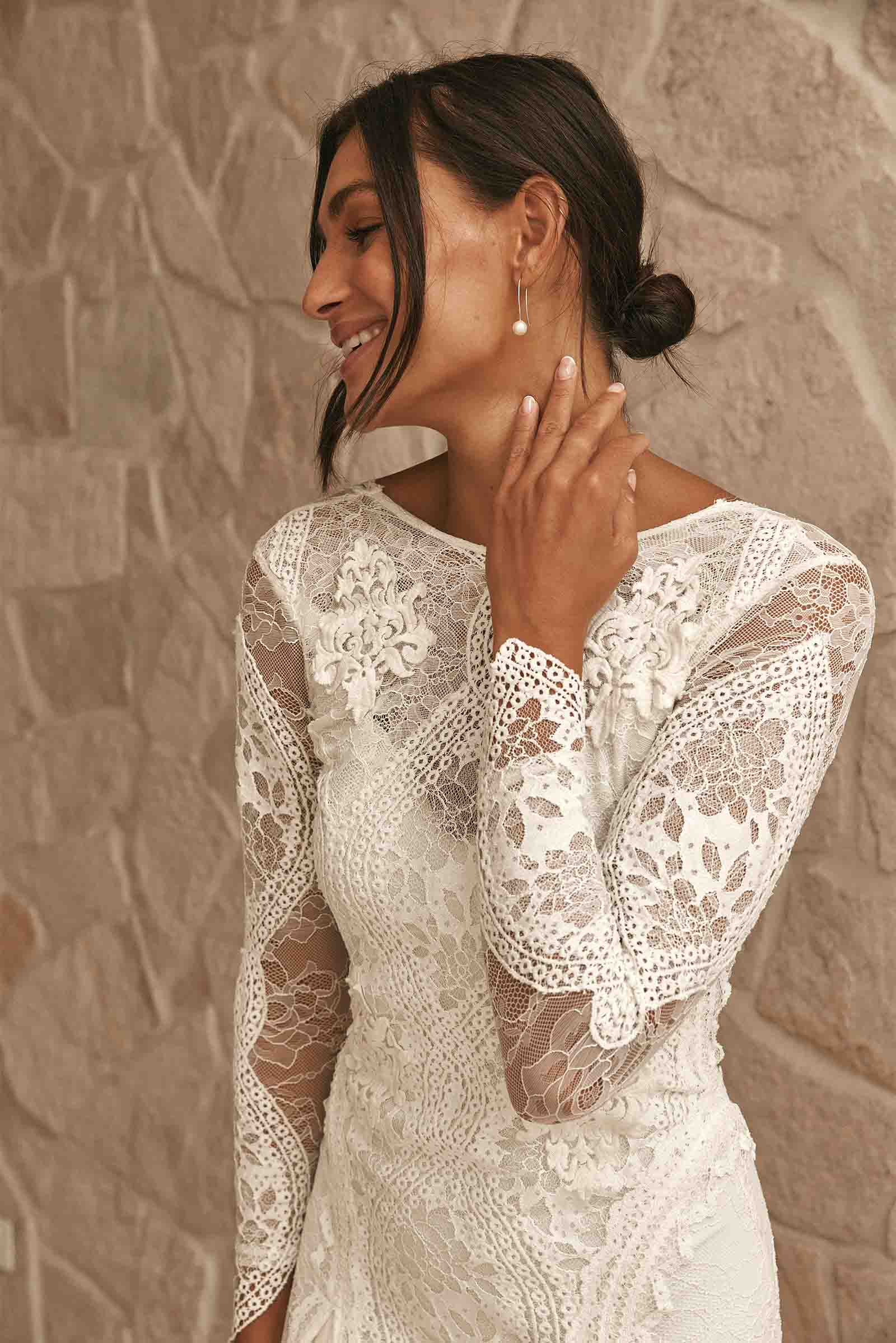 Traditional romance is embodied in Inca. This high neck wedding dress features distinctive shapes and contouring, where the body is celebrated.
