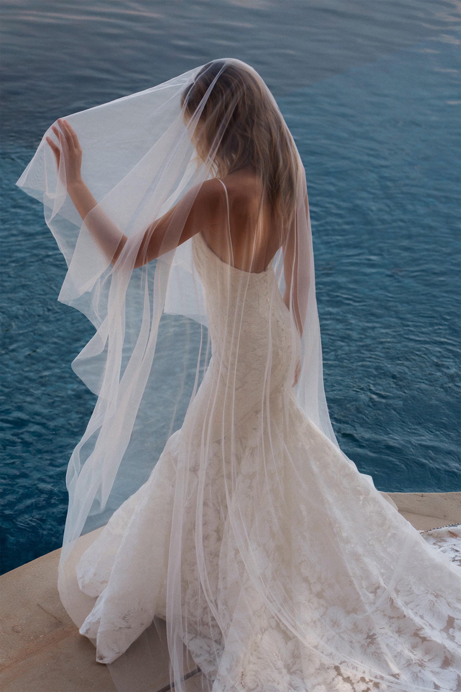 Our Lunaria veil, for a barely there look. Crafted from soft ivory tulle, this drop veil falls seamlessly without gather at the comb, for weightless drape and soft movement. The blusher layer offers versatile styling, whether worn over the face or gently draped behind.