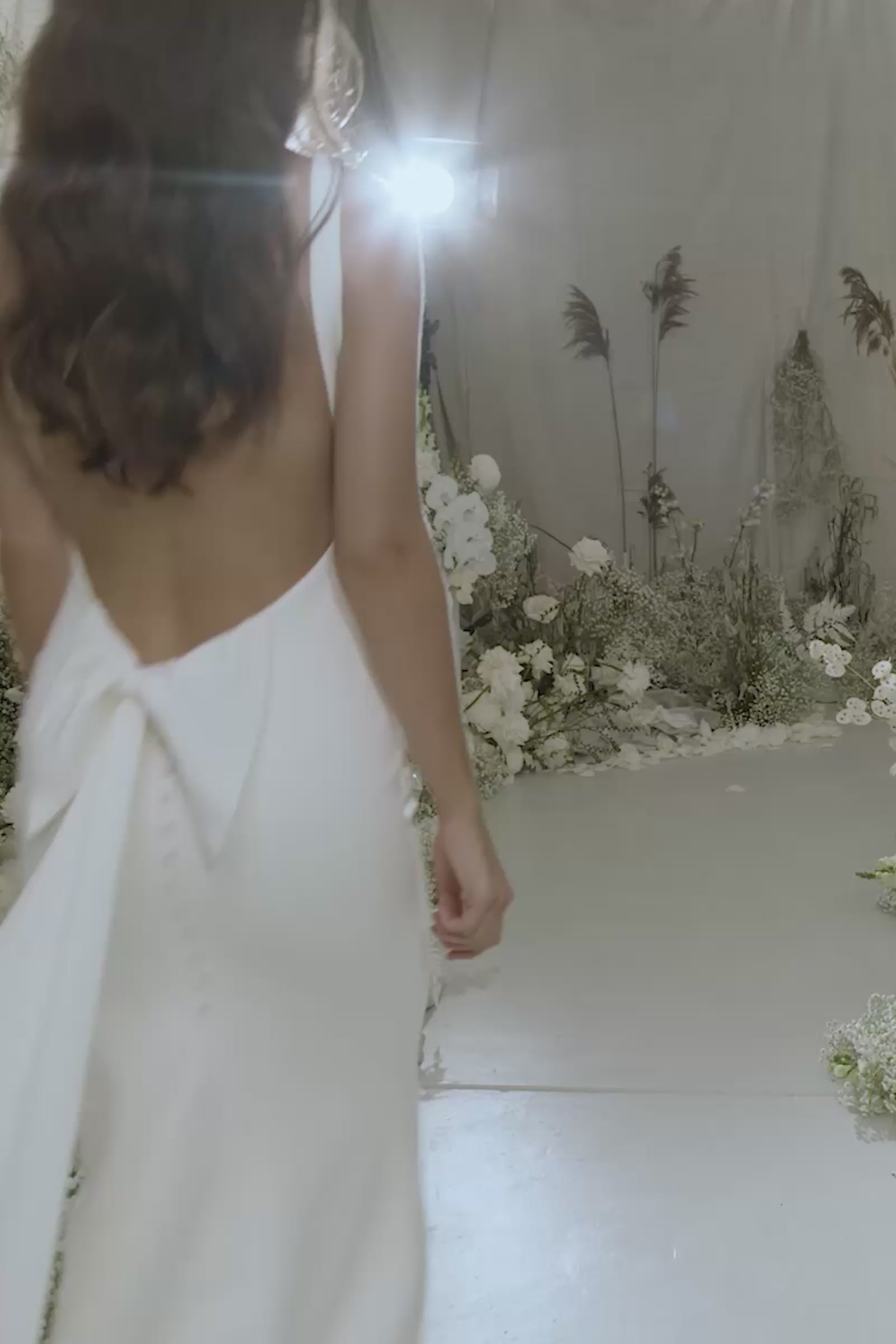 Minimalist with more, we introduce the Martini gown. A refined and contemporary low-back wedding dress crafted with a buttery soft stretch crepe that complements the fit of the gown.