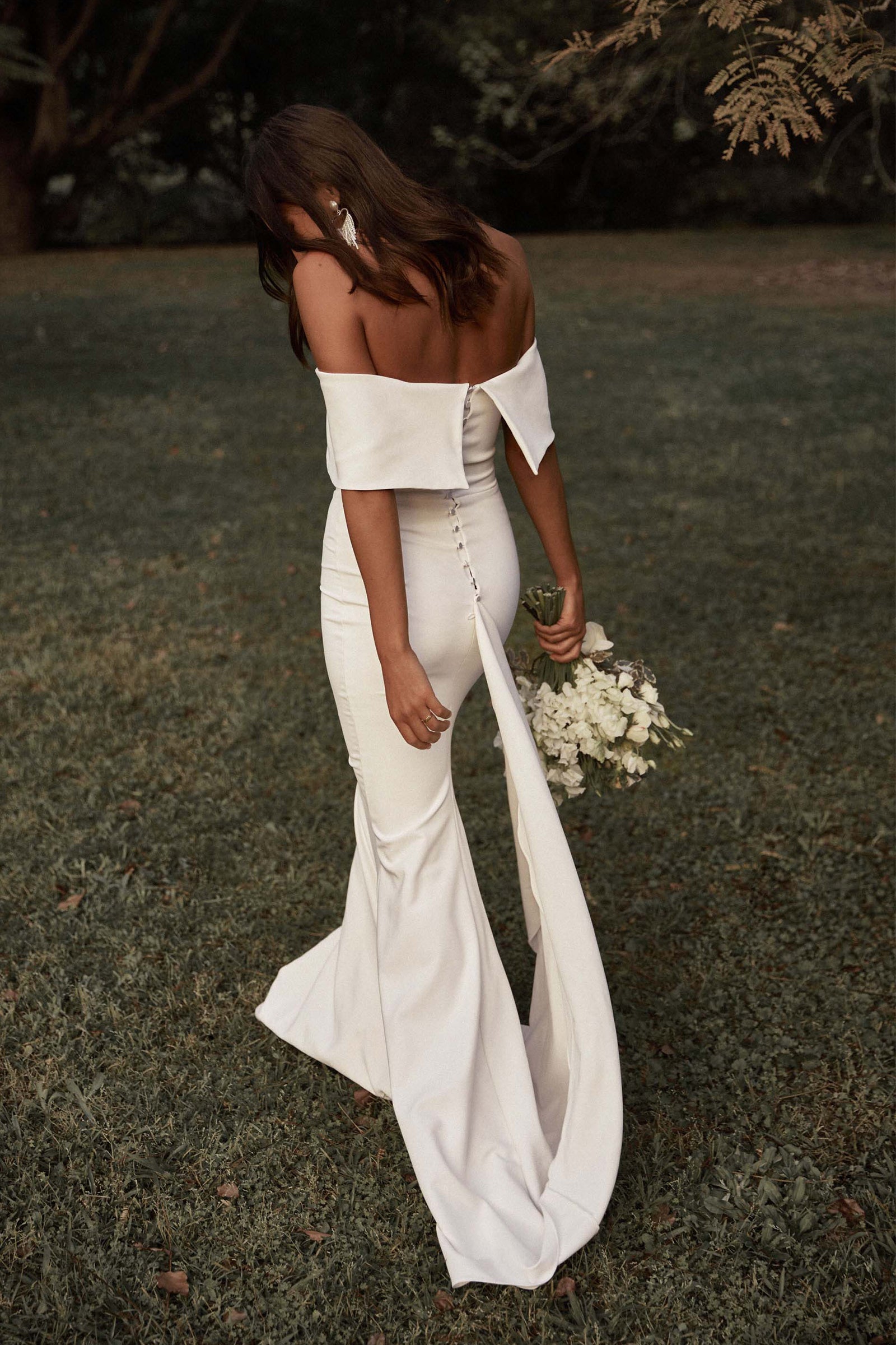 Mila is a classic silhouette for the modern era. Ethically handcrafted from buttery stretch crepe that accentuates the body, this elegant off-the-shoulder wedding dress is a true Grace favourite.