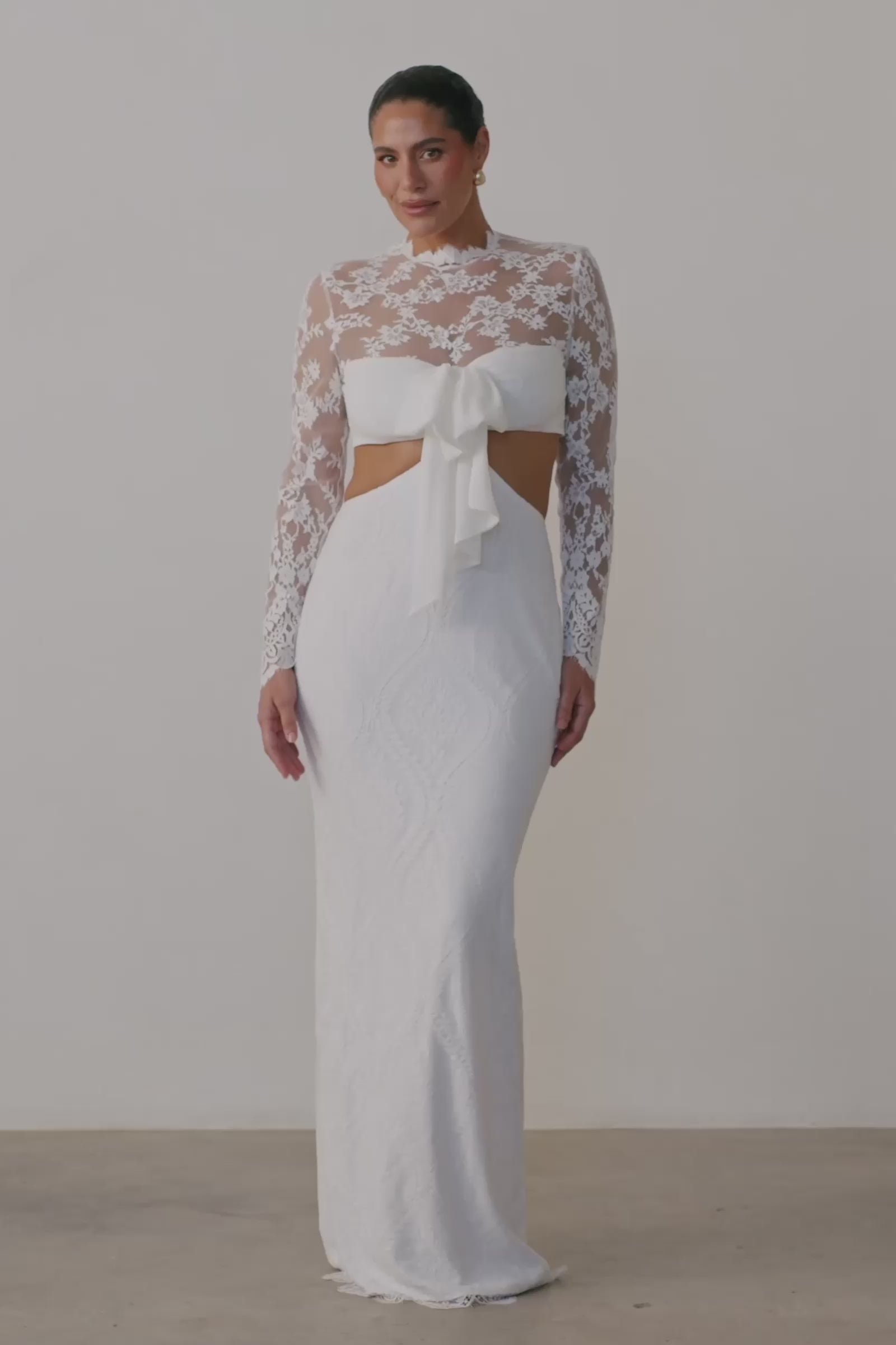 With sheer long sleeves, a bow detail at the bodice and an open back, she's a statement in lace, made for celebrating. The perfect plus one for your bridal wardrobe, from rehearsal dinner to second look and everything in between.