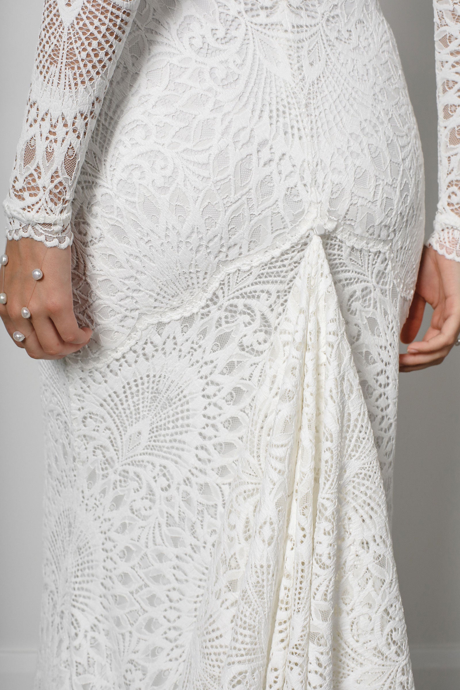 Nathalia infuses delicate textures with refined elegance brought to life through intricate trims and panelling. The decolletage is elegantly accentuated with a lace off-the-shoulder neckline that is divinely feminine.