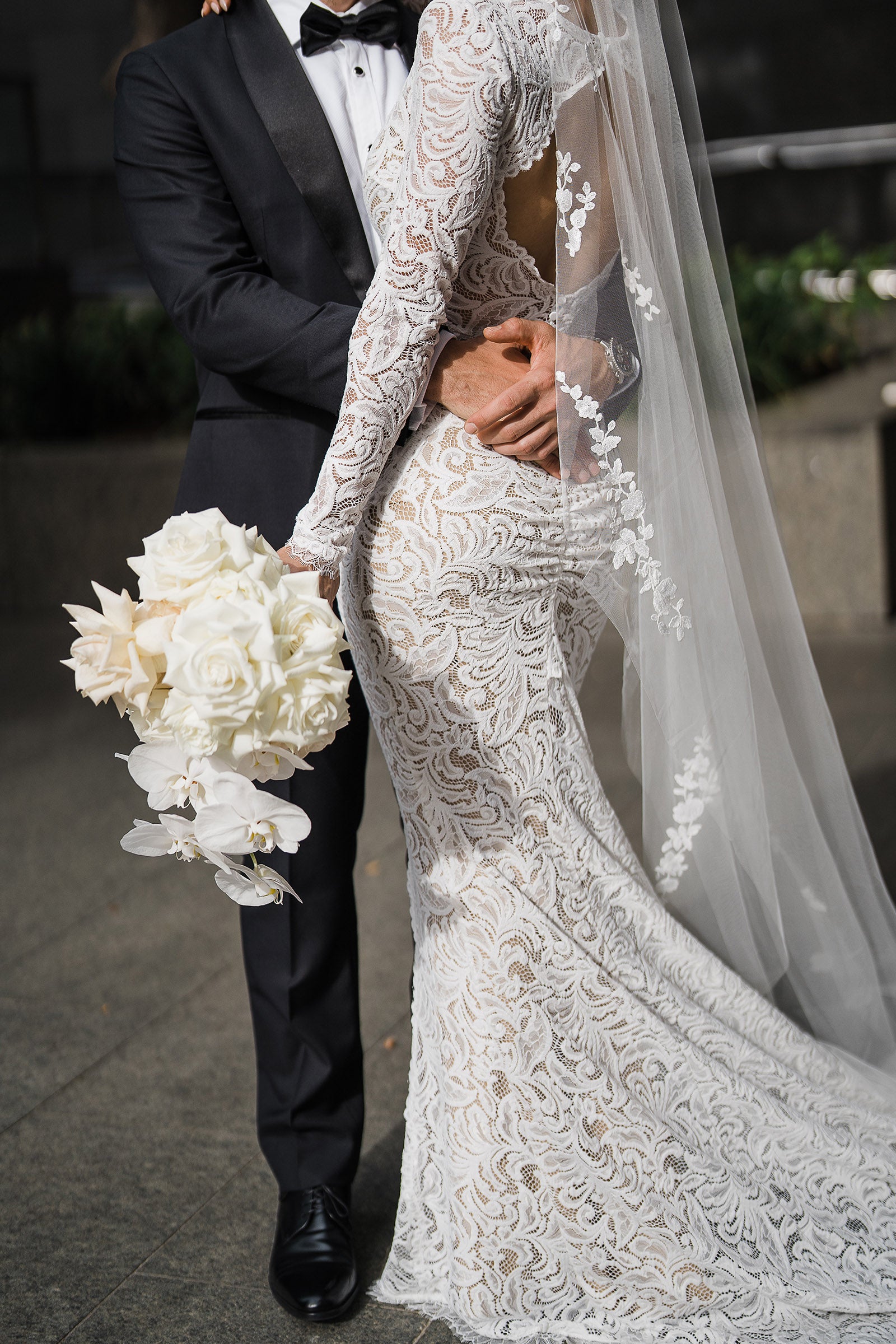 • I loved feeling free and flowy. I didn’t want to feel constricted or heavy in a wedding gown and my dress made me feel so comfortable. The delicate detail in the lace of the gown was beautiful and I love that it was made to fit my body and I didn’t have to stress about gaining or losing weight before my wedding and needing last minute alterations.