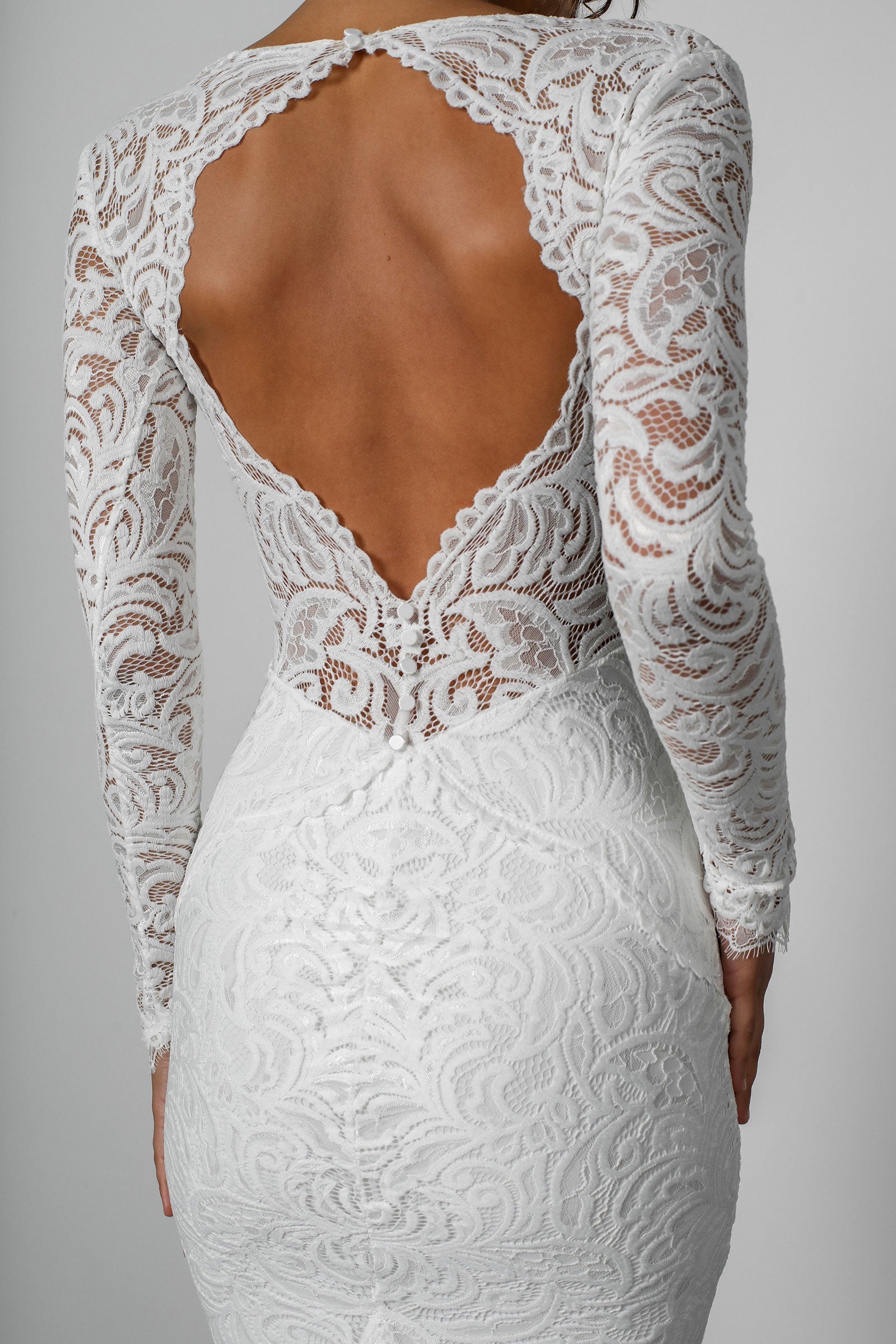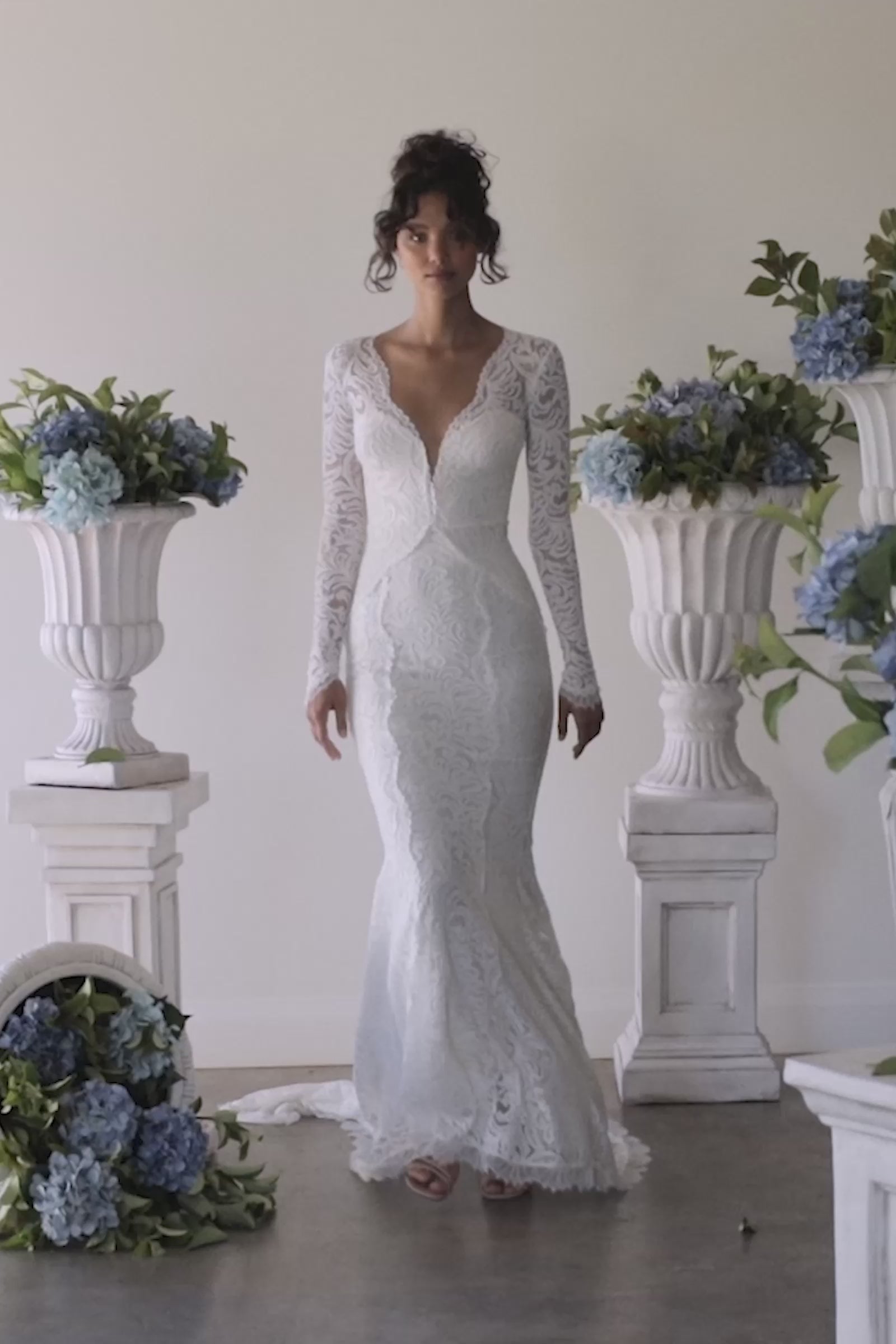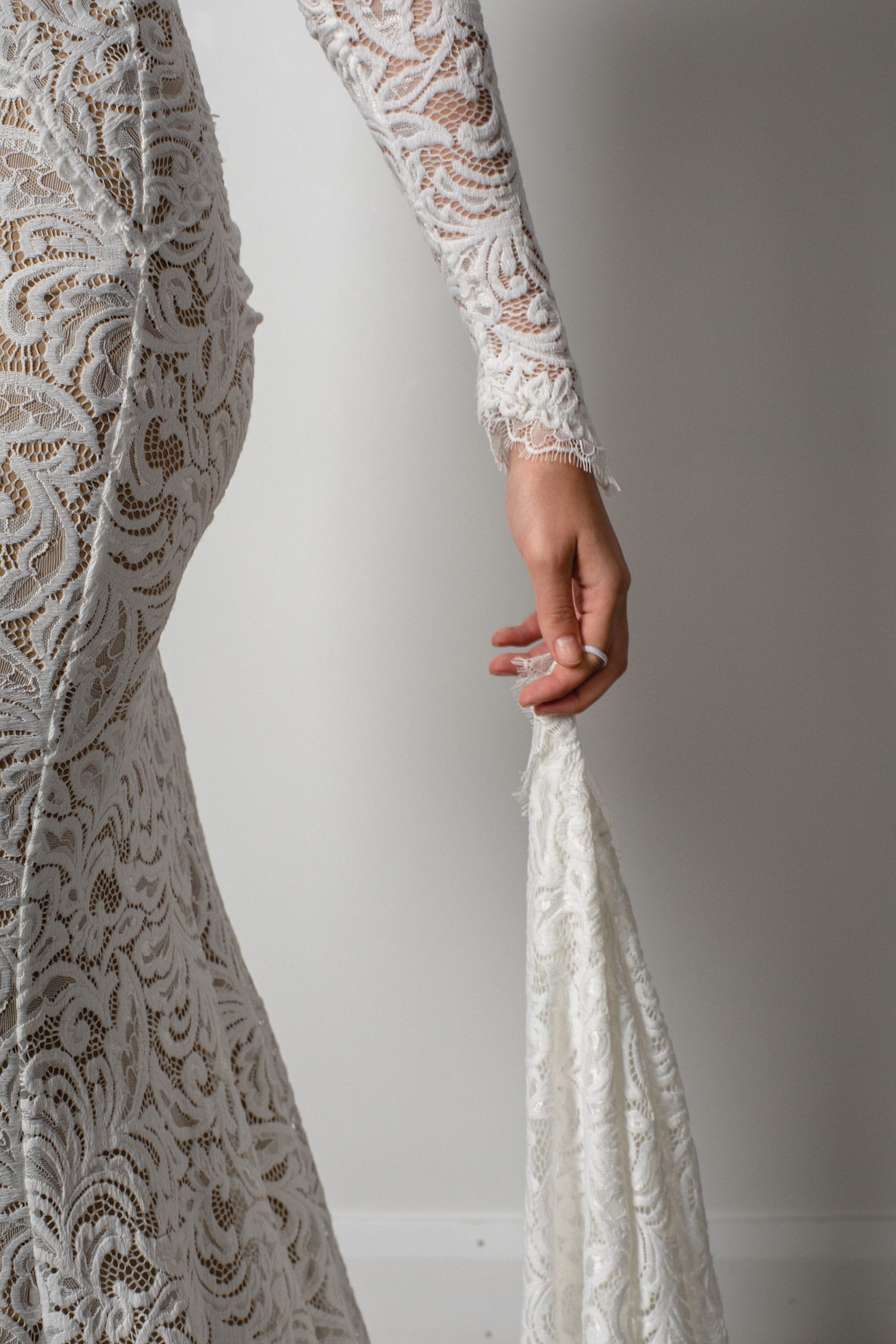 Textural elegance is embodied through Olive. A feminine, long sleeve lace wedding dress is brought to life through illusion panelling and a soft v neckline.