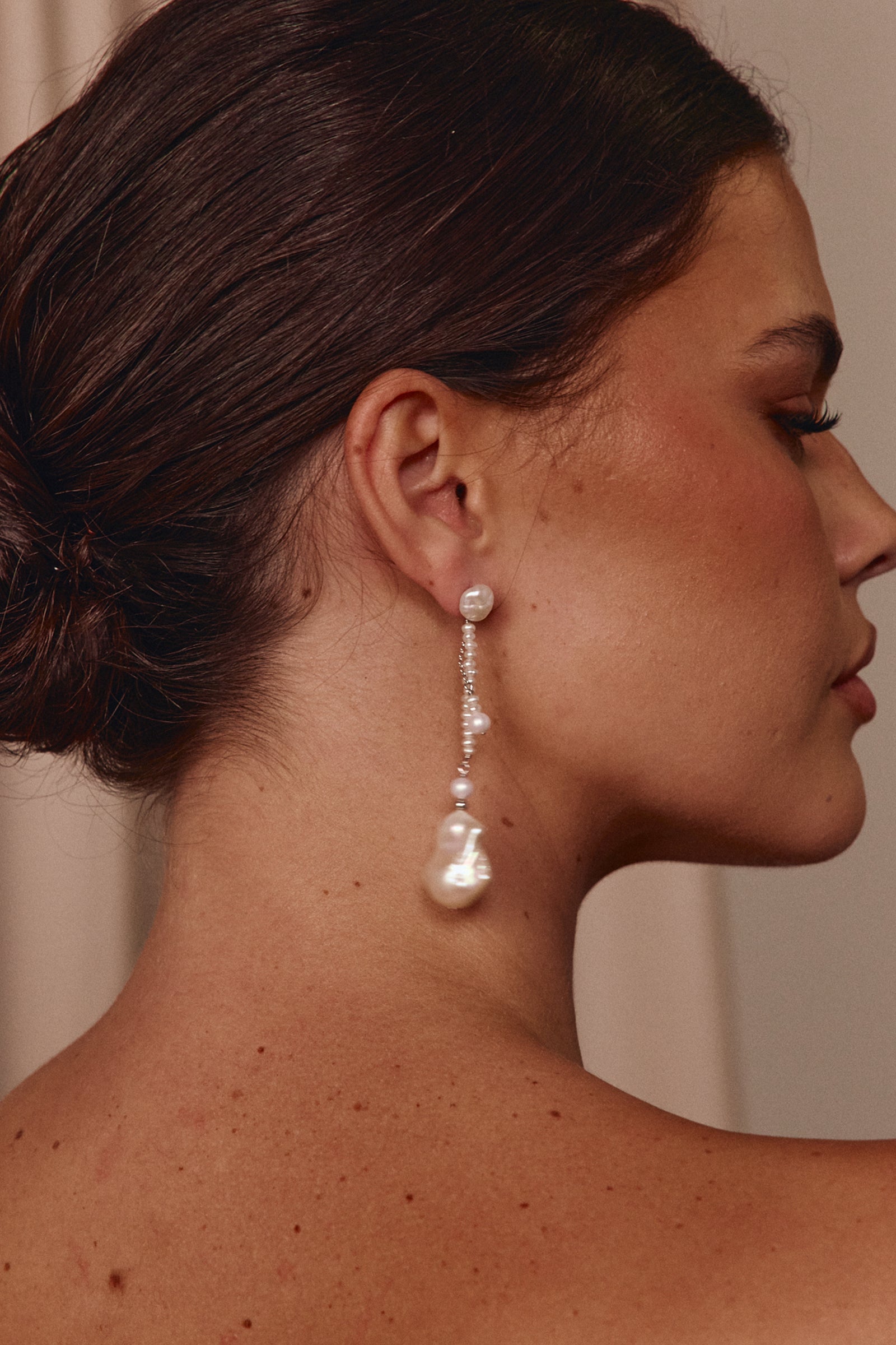 Unique in detail, the Seren bridal earrings are designed with cascading freshwater pearls and luminous baroque drops, made to make a statement with every step.