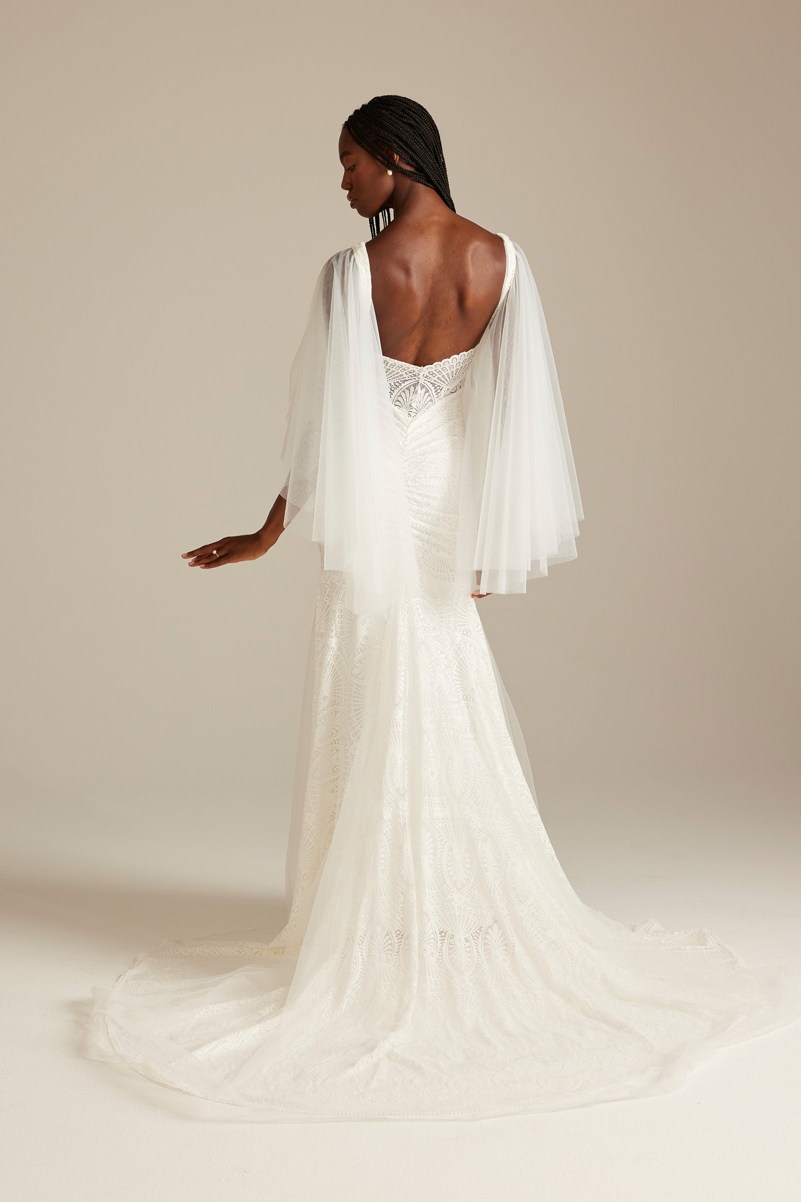 An elegant v-neckline and scalloped edge lace offer a dreamlike finish to this fit-and-flare gown.