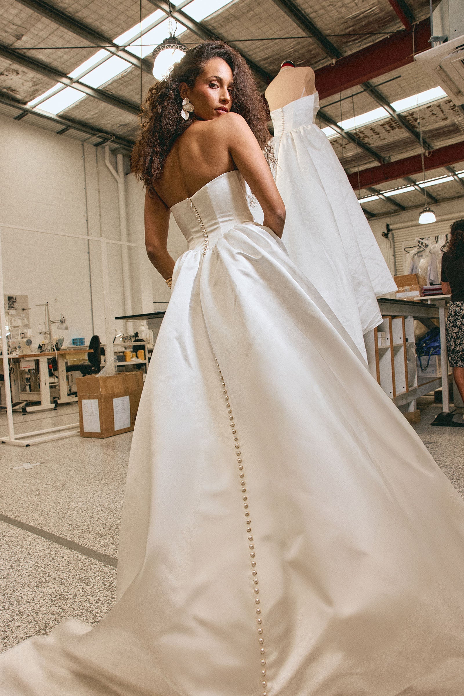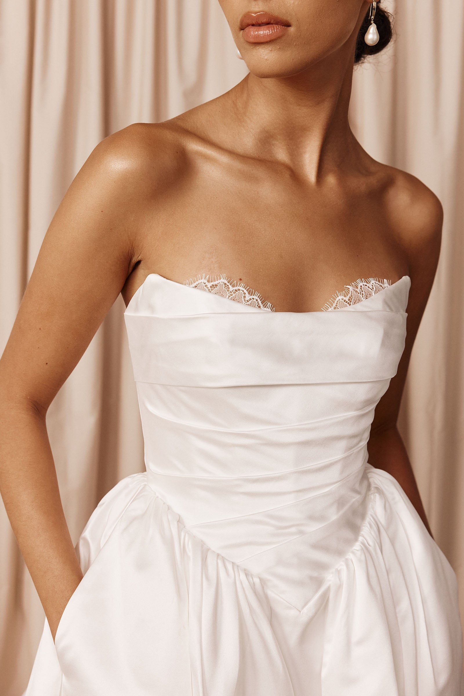 Vittoria was made to make an entrance. A Basque-waist wedding dress designed to feel timeless beyond trends, she’s crafted from our luminous Mikado satin – a contemporary, glossy fabrication with a rich, weighted drape for an elevated finish. Structured yet soft to the touch, the fabric holds, flatters, and moves with ease, giving Vittoria her signature balance of drama and effortlessness.