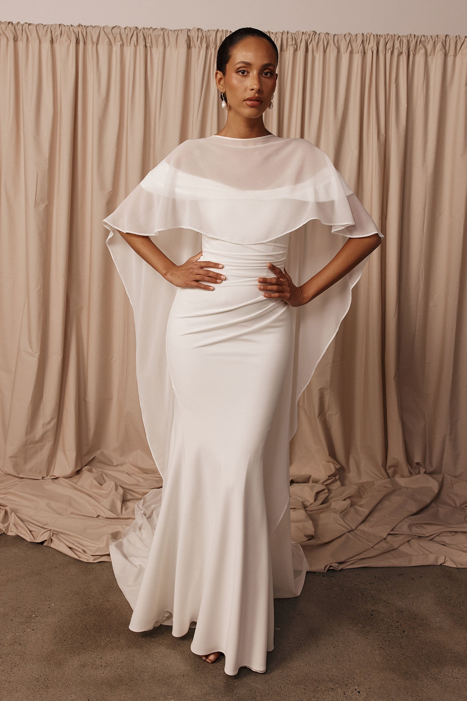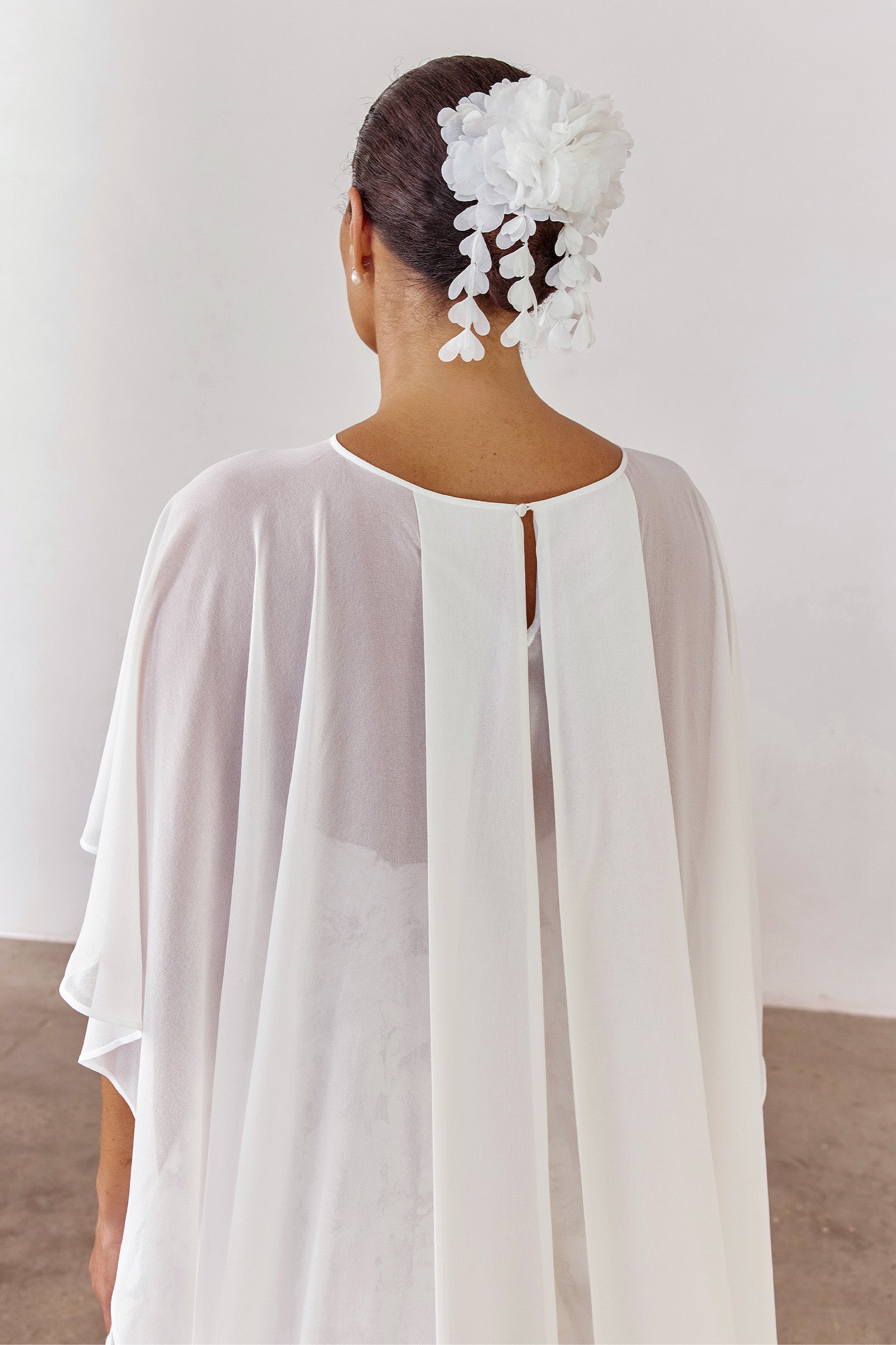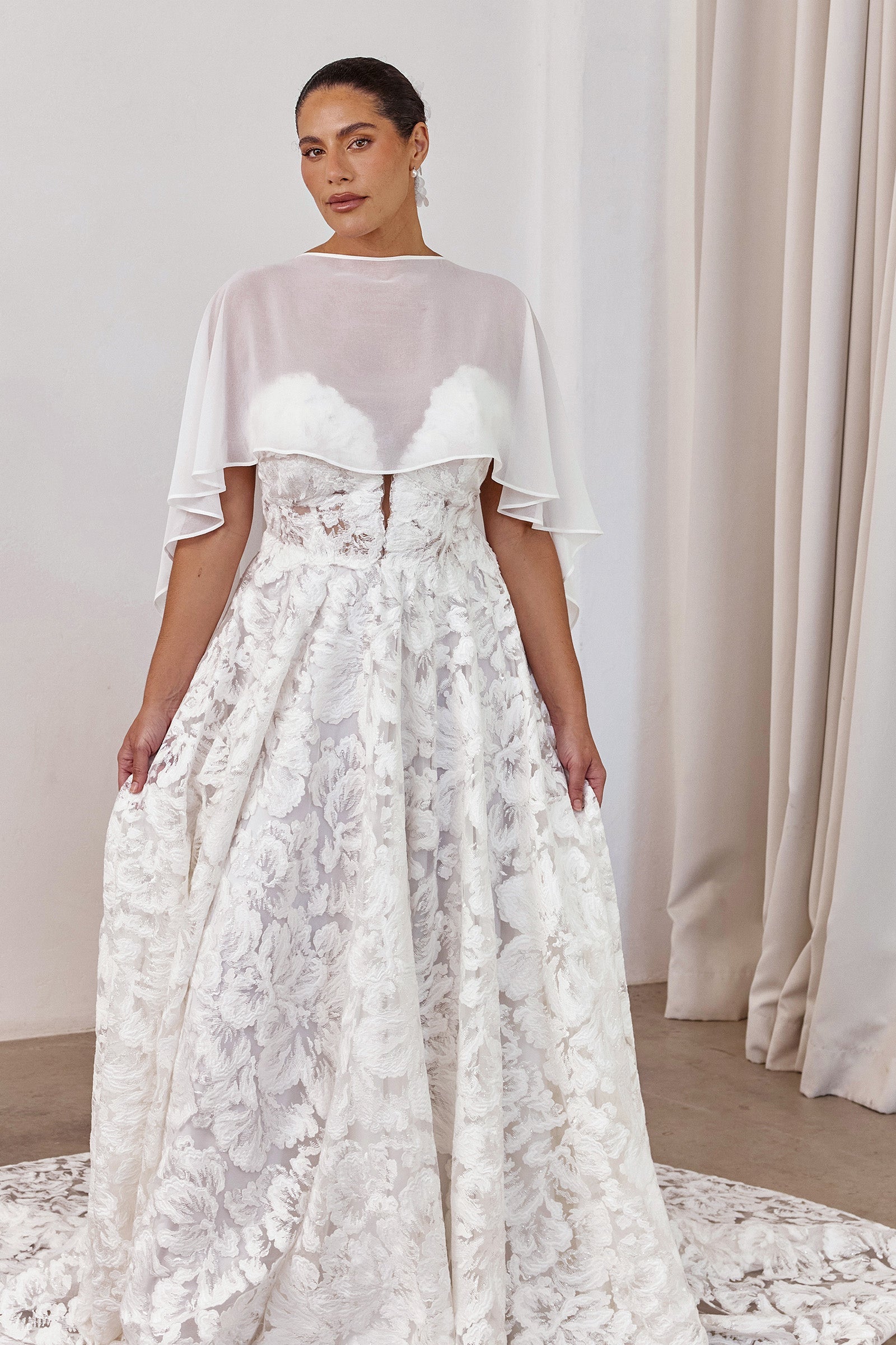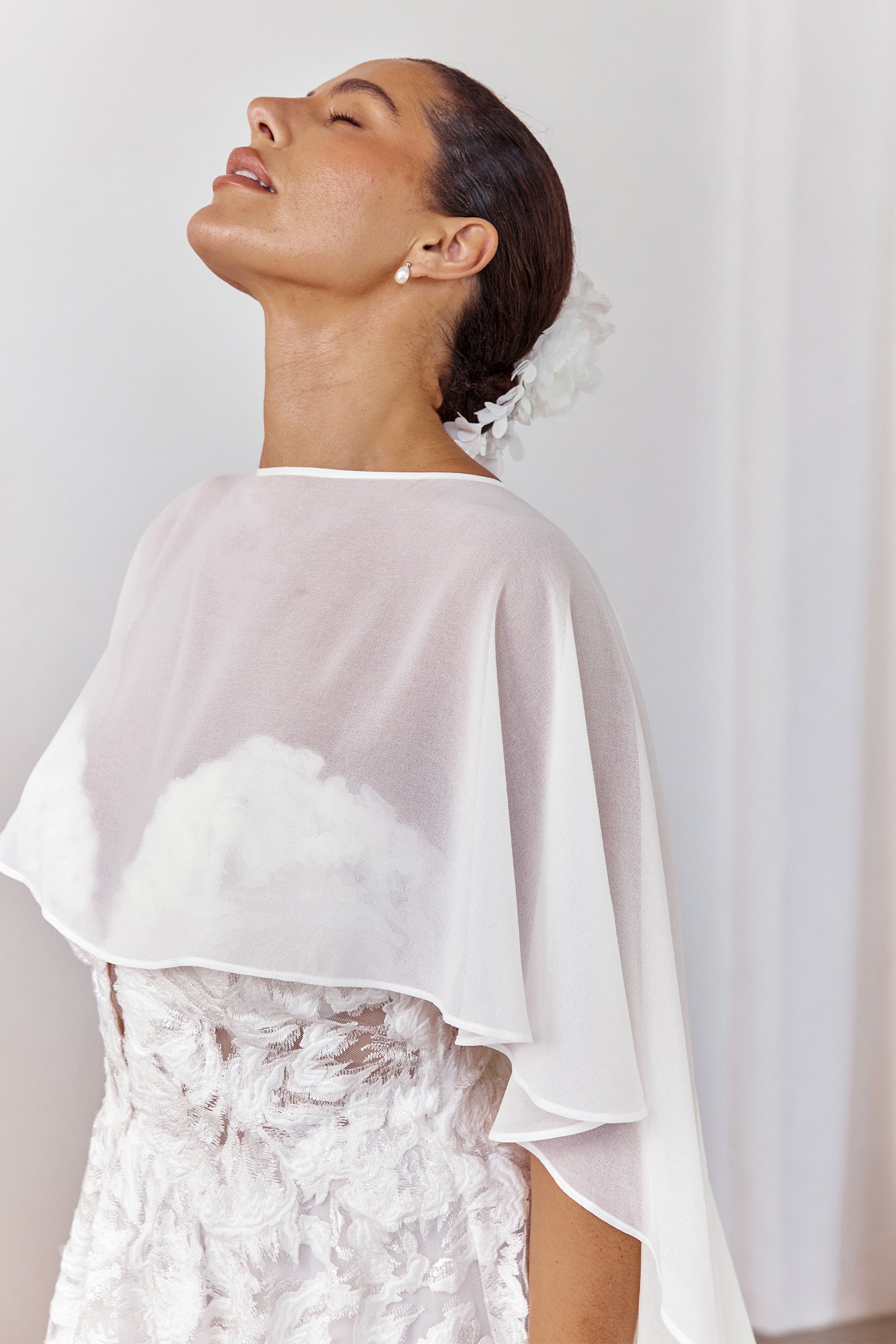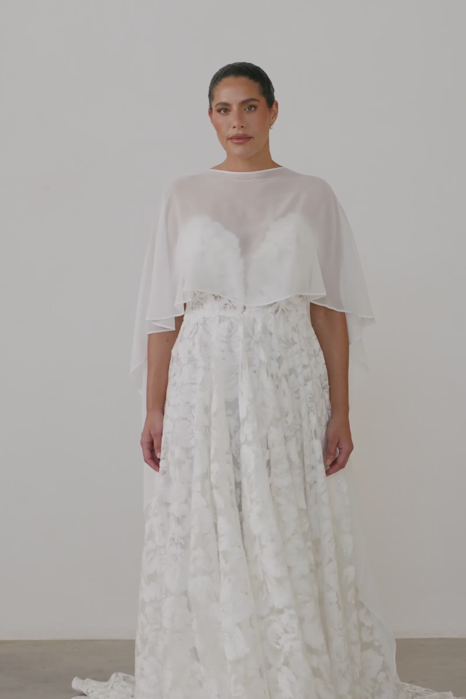 A sheer layer for elevated styling. The Whisper Cape is made from poly georgette with a soft, silk-like finish. Light and fluid, this barely-there wedding shawl adds a soft, European-inspired layer to any Grace gown.